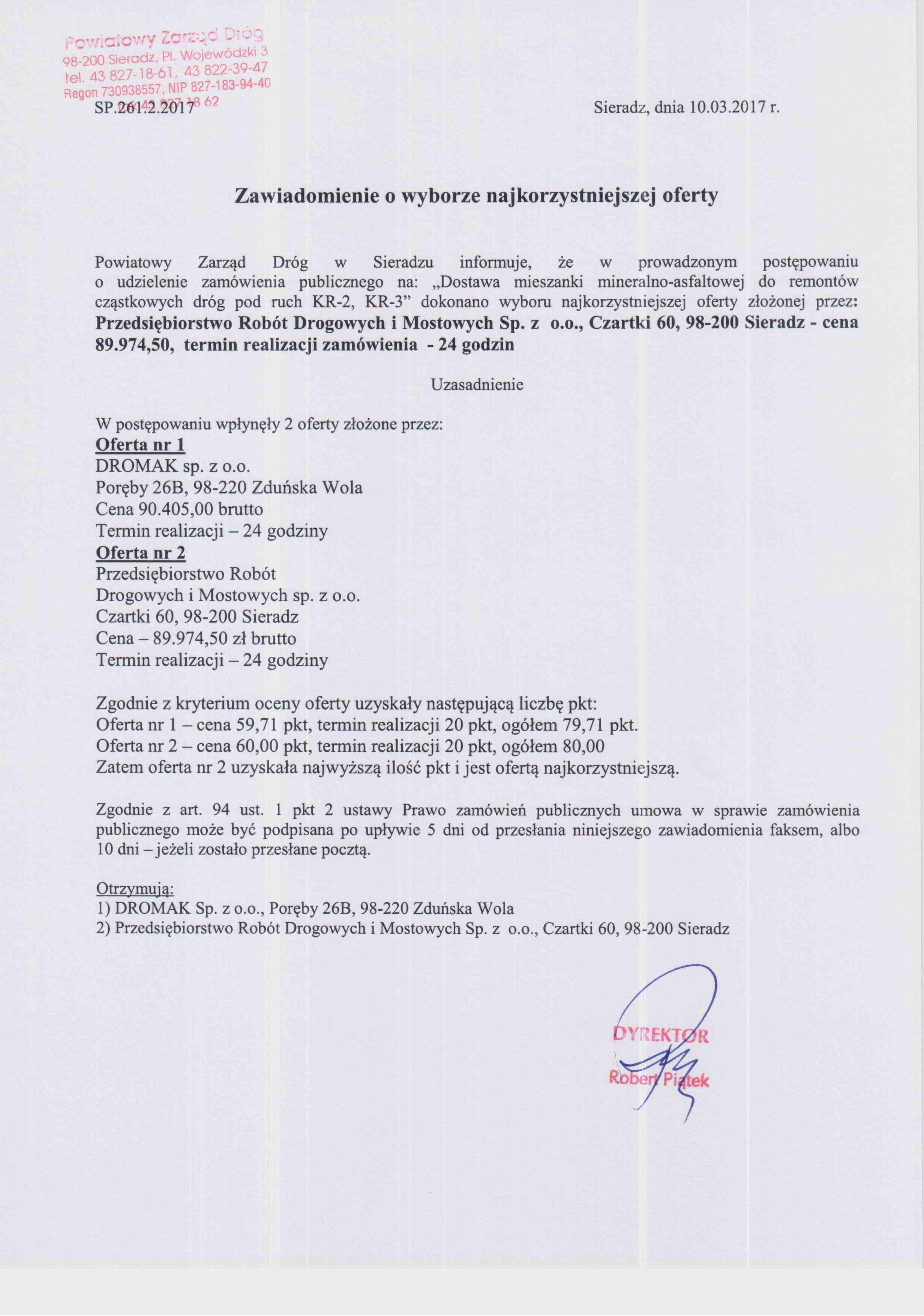 Zawiadomienie o wyborze najkorzystniejszej oferty na dostawę mieszanki mineralno-asfaltowej do remontów cząstkowych dróg pod ruch KR-2, KR-3