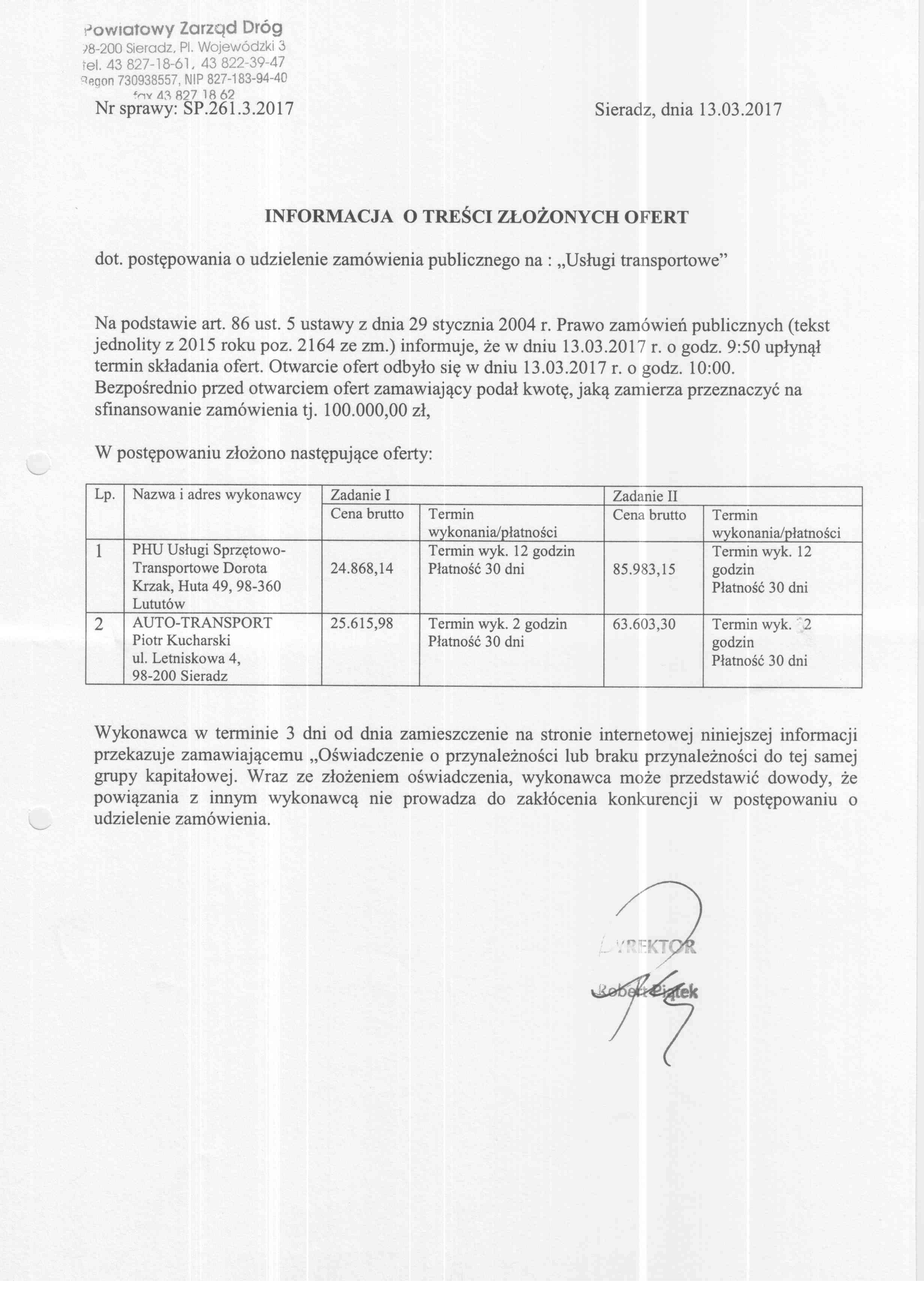 Informacja o treści złożonych ofert na: "Usługi transportowe"