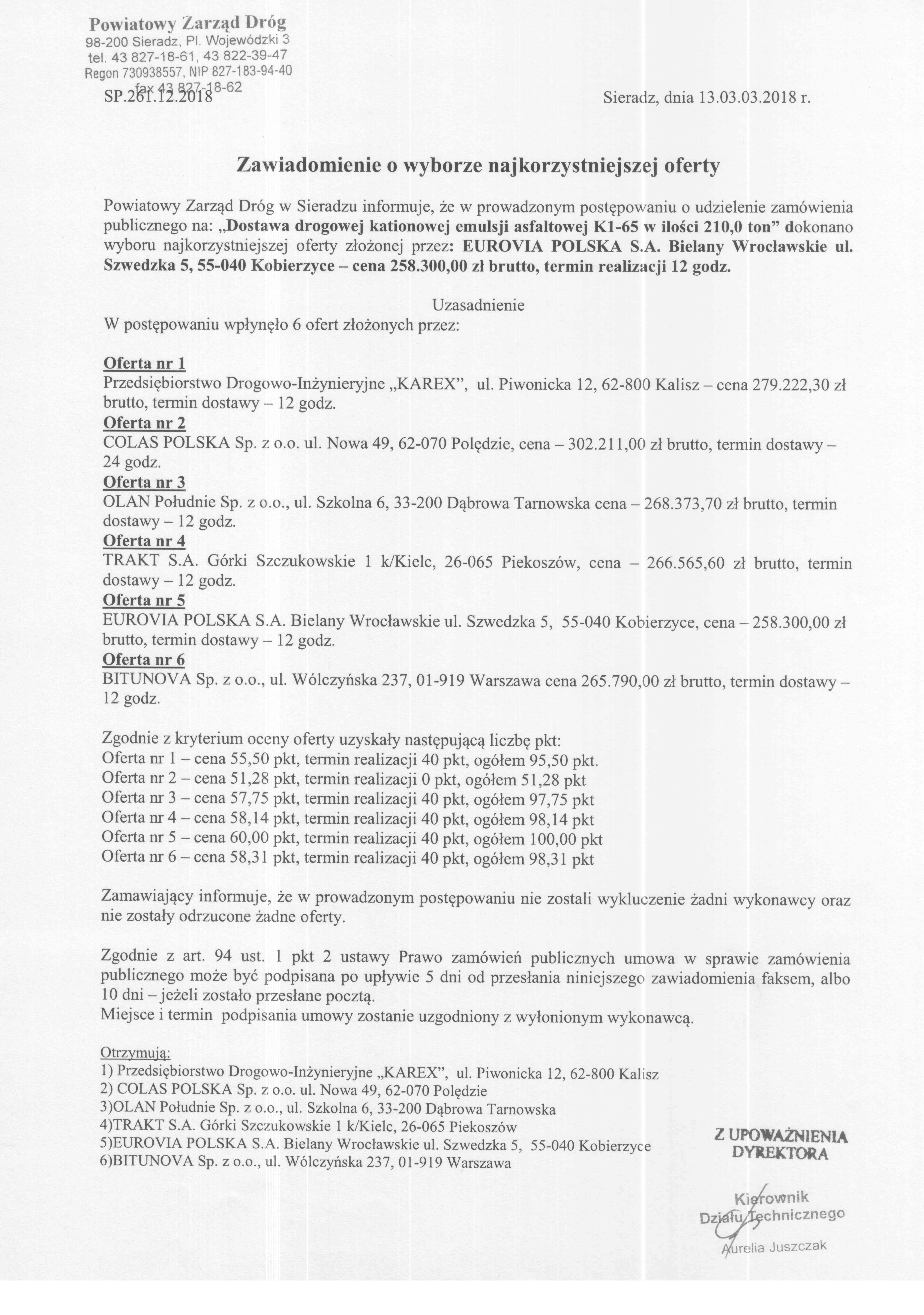 Zawiadomienie o wyborze najkorzystniejszej oferty na: ,, Dostawa drogowej kationowej emulsji asfaltowej K1-65 w ilości 210,0 ton"
