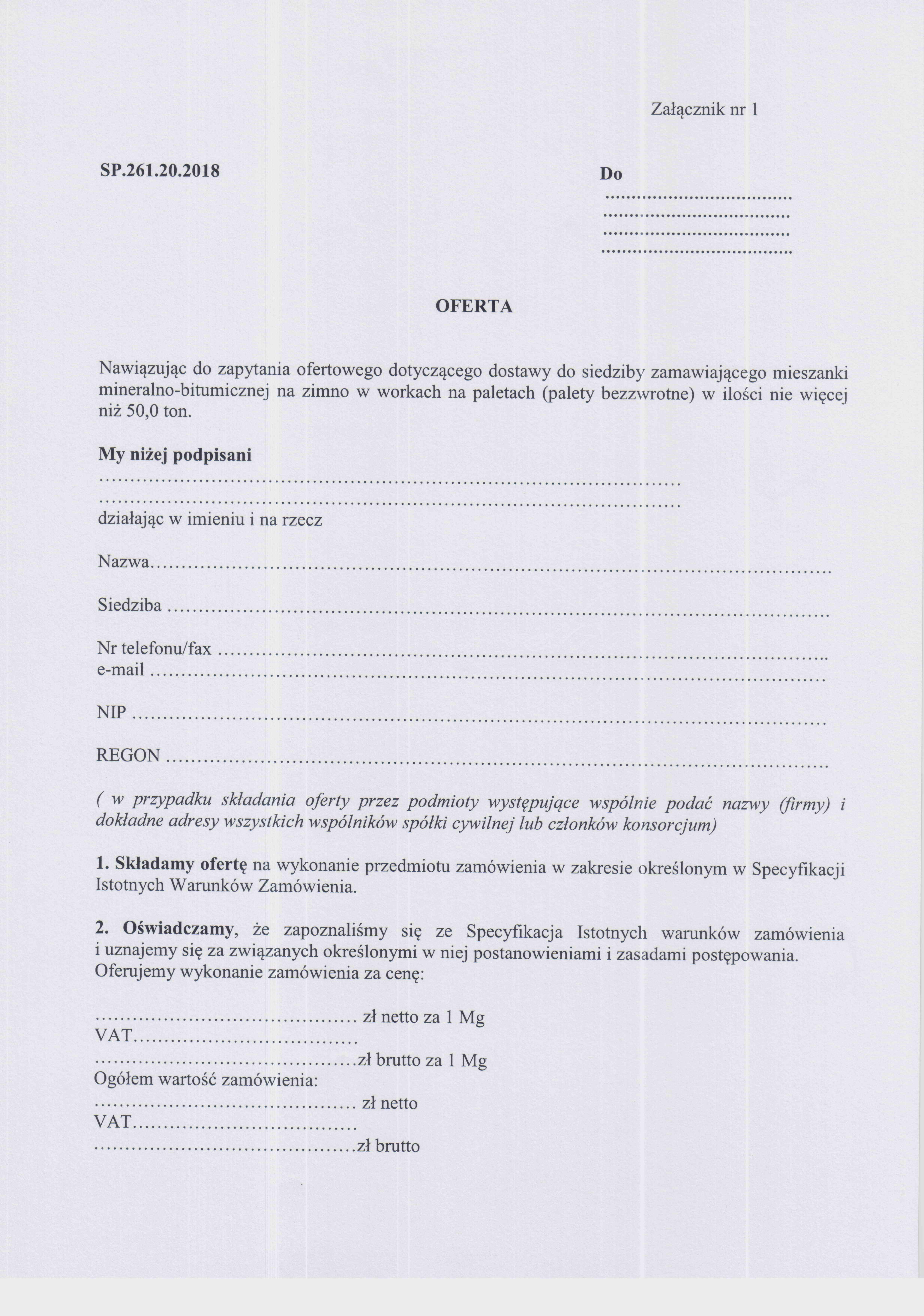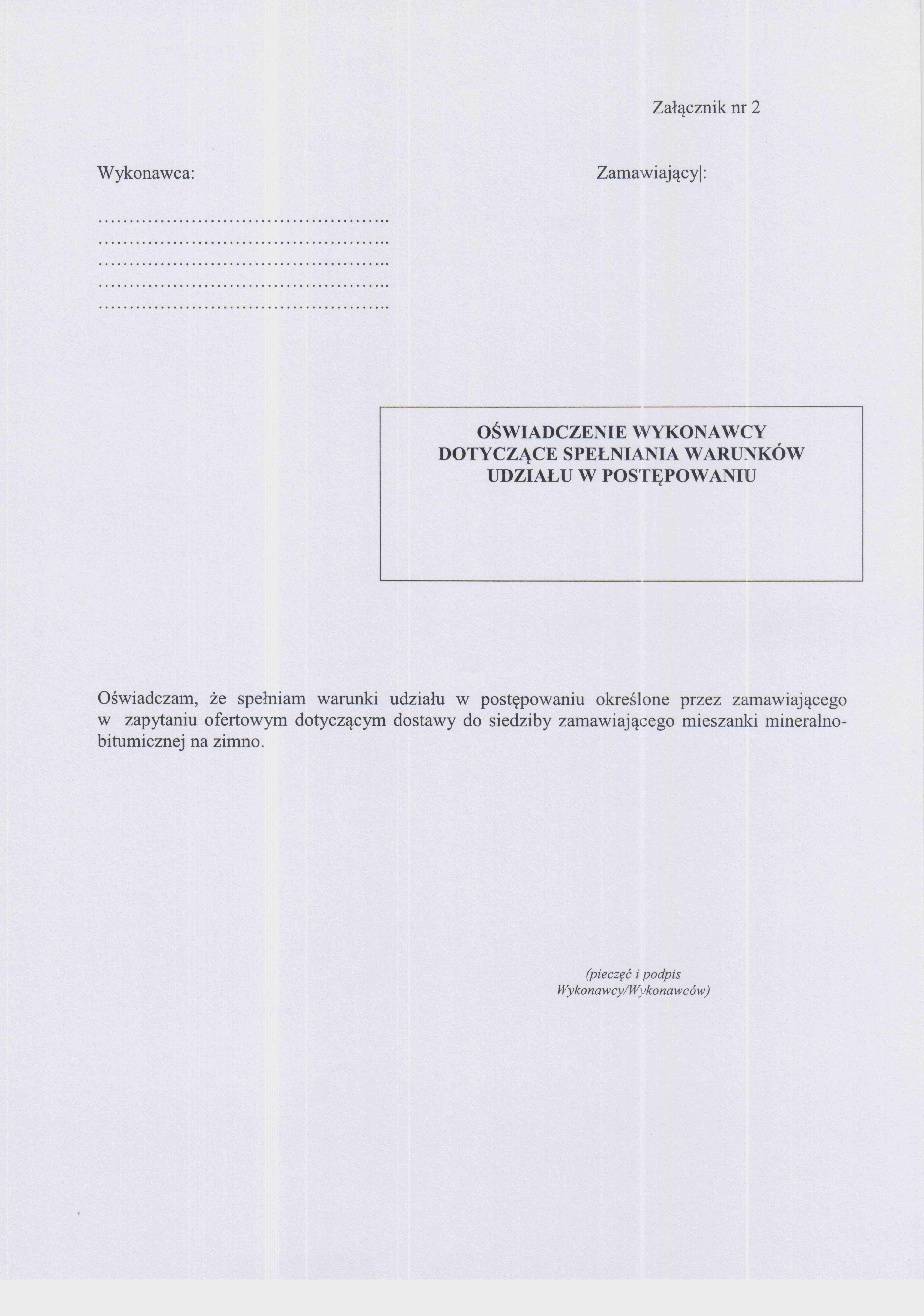 Zapytanie ofertowe na: ,,Dostawa do siedziby zamawiającego mieszankę mineralno-bitumiczną na zimno w workach na paletach w ilości nie więcej niż 50,0 ton"