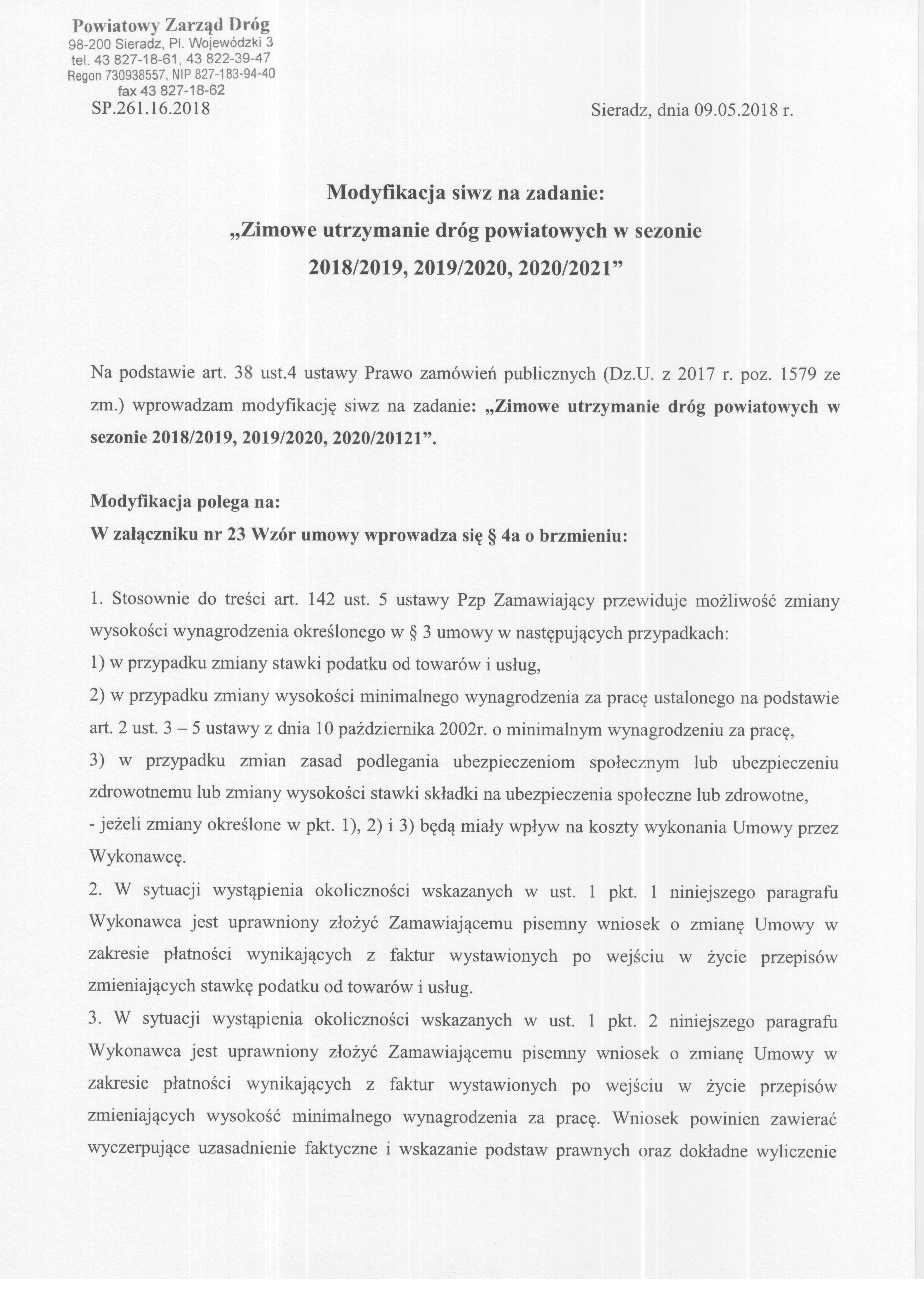 Modyfikacja SIWZ na zadanie: ,,Zimowe utrzymanie dróg powiatowych w sezonie 2018/2019, 2019/2020, 2020/2021"